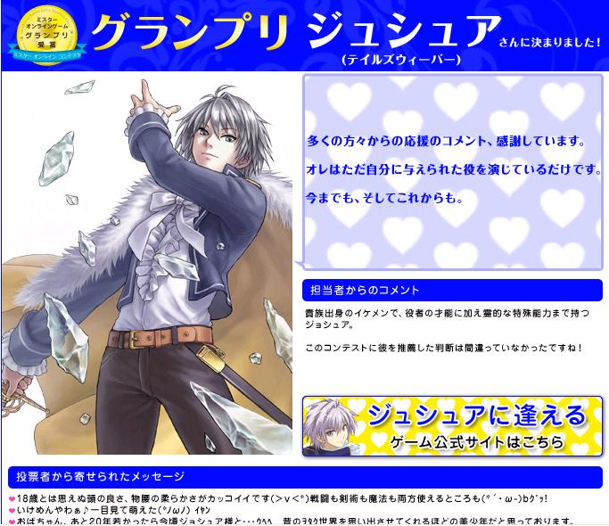 ミスターオンラインゲーム グランプリおめでとうジョシュア!!! 貴方がネトゲ界のイケメン王か・・・!! の前にー! 名wwww前wwwwww ”ジュ”シュアって誰なの。 名画に飾られていそうな名前。ジュー君^p^ 編集者しっかりっw 気づかない人は気づかない。 てか投票者からのメッセージにあったおばちゃん・・・w ジョシュアのwebマネー当たらないか・・・なっ(ソワソワ |